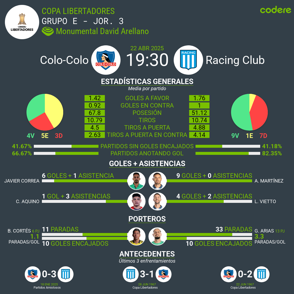 Para fortuna del Racing Club, el equipo argentino hizo los deberes en el estreno de la Copa Libertadores. Goleó con facilidad a Fortaleza a domicilio con el 0-3 en el marcador. Los realizadores de aquella cita fueron Maximiliano Salas, Ezequiel Almendra y Santiago Sosa. Ya no puede permitirse el lujo de fallar si quiere pelear por la primera plaza del grupo. Además, vencer en casa de Colo Colo podría dejar al equipo chileno en una dura dinámica añadida a la tragedia.
